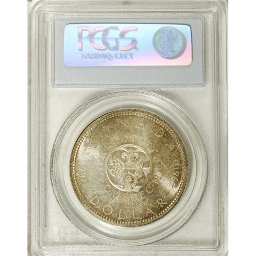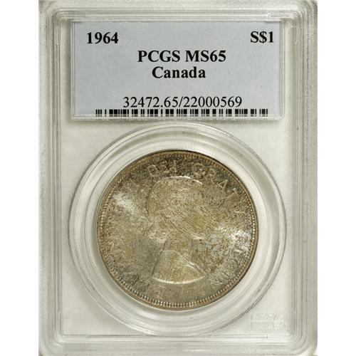 <B>Elizabeth II Dollar 1964, </B></I>KM58, MS65 PCGS, medium toning. Charlottetown commemorative. Very scarce grade.<BR><BR><b>Shipping:</b> Coin/Currency (<a target="_blank" href="http://www.heritageauctions.com/common/shipping.php">view shipping information</a>)