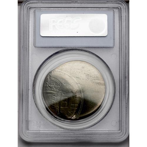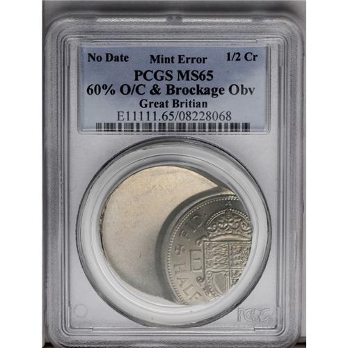 <B>Elizabeth II Error halfcrown. </B></I>S-4145 for type. MS65 PCGS. Date does not show. A spectacular mint error, designated as "60% O/C & Brockage" on the slab insert, which also calls it, in effect, pristine (as MS65). No one would argue, for it is both beautifully preserved and dramatic in appearance! Probably this is the only one like it in the entire world. Bid accordingly if you want to own it.