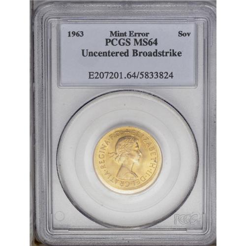 <B>Elizabeth II Error sovereign, 1963. </B></I>S-4125. MS64 PCGS, designated Uncentered Broadstrike. A beautiful piece glowing with bright amber-gold luster, with a "delicious" slightly cupped appearance to the reverse, the obverse slightly convex. Neat, neat, neat! Go find another one, see how rare this is.