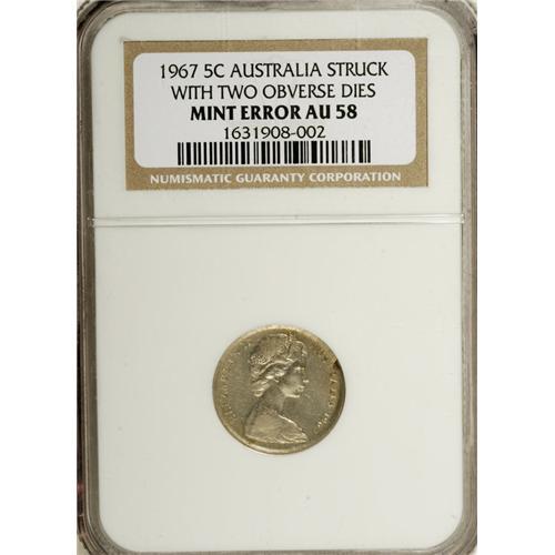 <B>Elizabeth II Mint Error 5 Cents 1967, </B></I>KM64, AU58 NGC, very rare error with two obverses, tiny edge flaw on one side.<BR><BR><b>Shipping:</b> Coin/Currency (<a target="_blank" href="http://www.heritageauctions.com/common/shipping.php">view shipping information</a>)