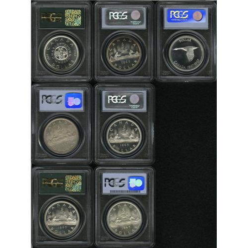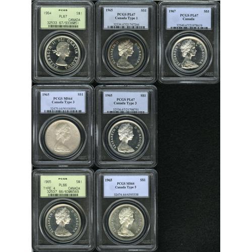<B>Elizabeth II PCGS Dollar Assortment, </B></I>1964 PL67, 1965 Type 1 PL67, 1965 Type 3 MS64, 1965 Type 3 PL67, 1965 Type 4 PL66, 1965 Type 5 MS64 and 1967 PL67.<BR><BR><b>Shipping:</b> Coin/Currency (<a target="_blank" href="http://www.heritageauctions.com/common/shipping.php">view shipping information</a>)