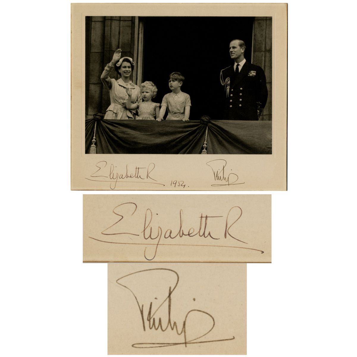 Queen Elizabeth II and Prince Philip signed Christmas card, dated 1954. Photo depicts the royal couple and two of their children, Charles and Anne, standing on a Buckingham Palace balcony. Printed greeting reads: ''With Best Wishes For Christmas and the New Year''. Signed beneath photo, ''Elizabeth R 1954.'' and ''Philip''. Card measures 8'' x 7'' with toning to one portion of card, though not affecting photo or signatures. Very good.