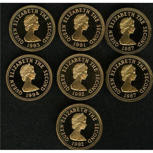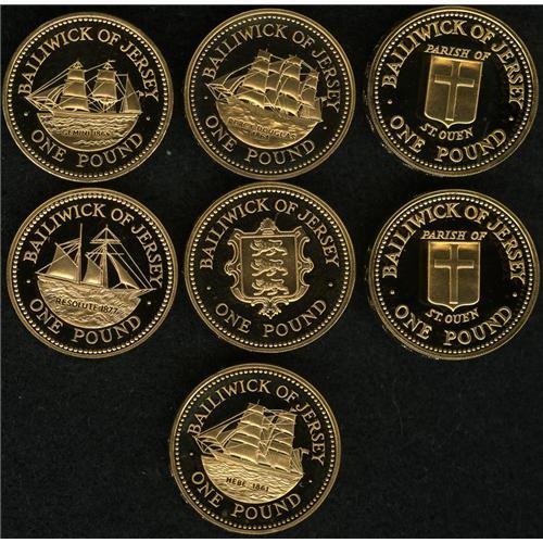 <B>Elizabeth II, Proof Gold Pound Assortment,</B></I> including 1987 Parish of St. Ouen, KM72b (2), 1991 Percy Douglas, KM85b, 1992 Hebe, KM86b, 1992 Ornamented Coat of Arms, KM87b, 1993 Gemini, KM88b and 1994 Resolute, KM91b. All coins are gem proof and have a listed mintage of 250 pieces, respectively.<BR><BR><b>Shipping:</b> Coin/Currency (<a target="_blank" href="http://www.heritageauctions.com/common/shipping.php">view shipping information</a>)