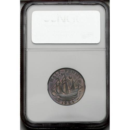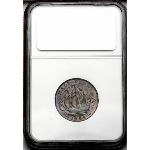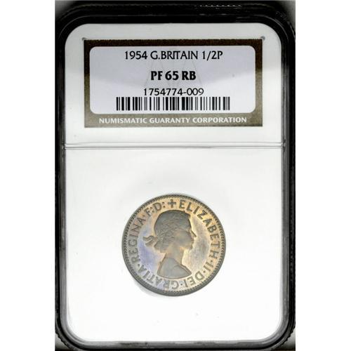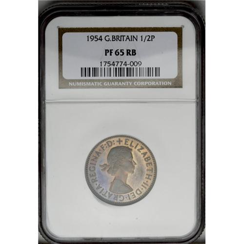 <B>Elizabeth II Proof halfpenny, 1954.</B></I> PF65 RB NGC. Type of S-4158 but unlisted by Spink. Peck-2509 does list this Proof of Record, noting it to be extremely rare. A truly delightful Gem Proof with vivid purplish gold iridescence, showing off the historic ship of Sir Francis Drake, from the days of the Armada.
