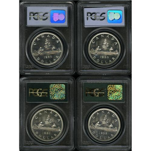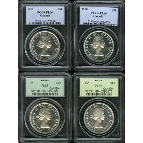 <B>Elizabeth II - Quartet of PCGS Prooflike Dollars, </B></I>1959 PL66, 1960 PL66, 1961 PL66, and 1962 PL66.<BR><BR><b>Shipping:</b> Coin/Currency (<a target="_blank" href="http://www.heritageauctions.com/common/shipping.php">view shipping information</a>)