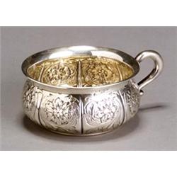 The sides embossed with flower blossoms. Marked under rim.