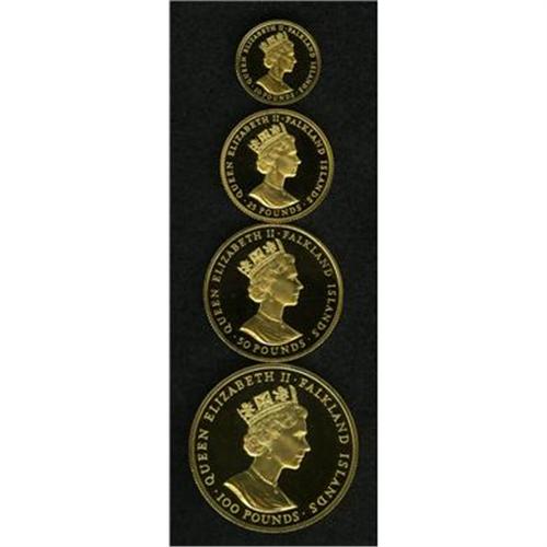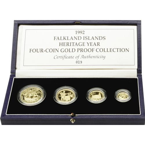 <B>Elizabeth II gold 4-piece Proof set 1992,</B></I> KM-PS10, to commemorate "the 400th anniversary of the first reported sighting of the Islands" by British captain John Davis. The insert card printed by the Royal Mint also notes that this was the 10th anniversary (14 June 1982) of "the liberation" of the islands from "Argentine occupation." So this really celebrates the British victory of the Falkland Islands War. Elegant coins, all Gem cameo Proofs, in Royal Mint blue plush case and capsules as issued. Proof mintage of 400 sets, of which this is #019. Comes with RM insert explaining fineness, weights and mintage. Issue price was $1,595.<BR><BR><b>Shipping:</b> Coin/Currency (<a target="_blank" href="http://www.heritageauctions.com/common/shipping.php">view shipping information</a>)