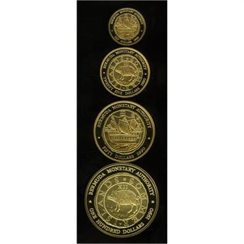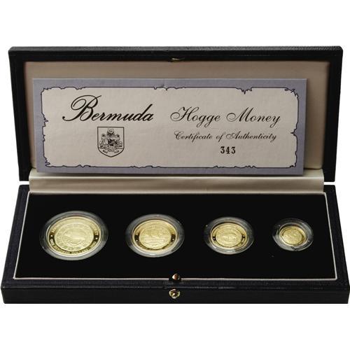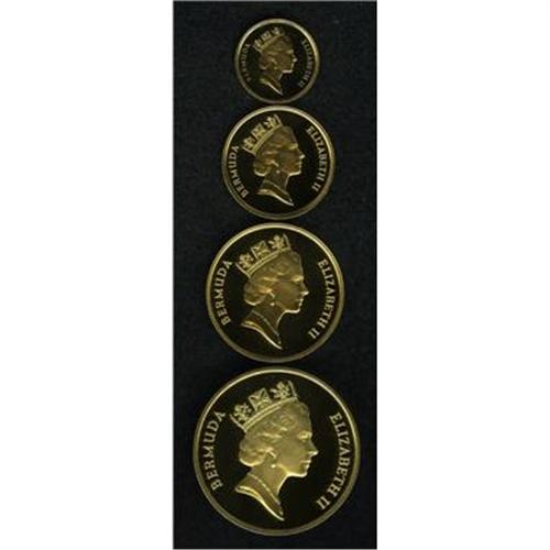 <B>Elizabeth II gold Hogge Money Set 1990, </B></I>KM-PS11, comprising KM74-77, the 10, 25, 50 and 100 Dollars celebrating Bermuda's first coinage. All four coins are gem cameo Proof in the case of issue with the certificate of authenticity. An attractive set with a numismatic motif.<BR><BR><b>Shipping:</b> Coin/Currency (<a target="_blank" href="http://www.heritageauctions.com/common/shipping.php">view shipping information</a>)