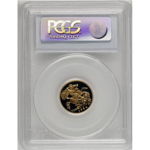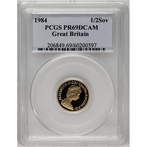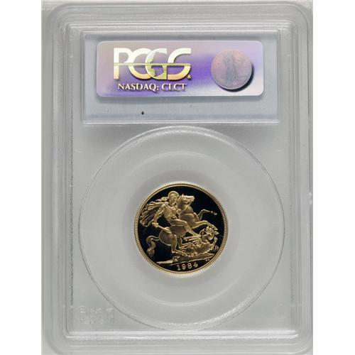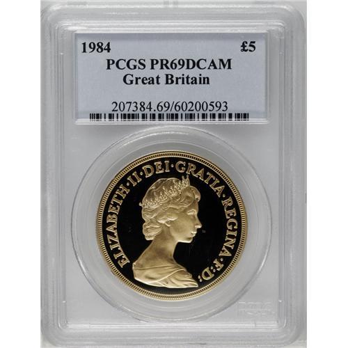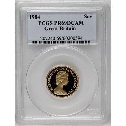 <B>Elizabeth II gold Proof set, 1984.</B></I> S-PGS05 (PS115). 7,095 sets issued. Consists of 3 wonderful coins, as issued in the set: 5-pounds, sovereign, half-sovereign. A super-duper set, each coin graded by PCGS as PR69 DCAM. Wow! Catalogues in the 2006 Spink value guide for about $1200 in normal state. Here is a bonus, each one encapsulated by PCGS and given an extremely high grade.