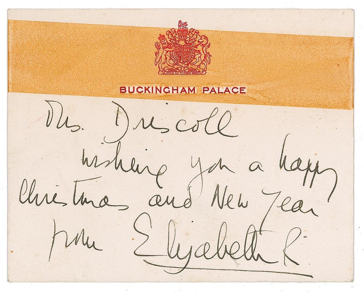 ANS signed “Elizabeth R,” one page, 4.75 x 3.75, Buckingham Palace letterhead, no date. Her Royal Majesty sends greetings to Mrs. Driscoll. In full: “Wishing you a happy Christmas and New Year.” In very good condition, with strip of adhesive remnants across the top, covering the raised lettering and crest, and a few scattered spots of soiling.
