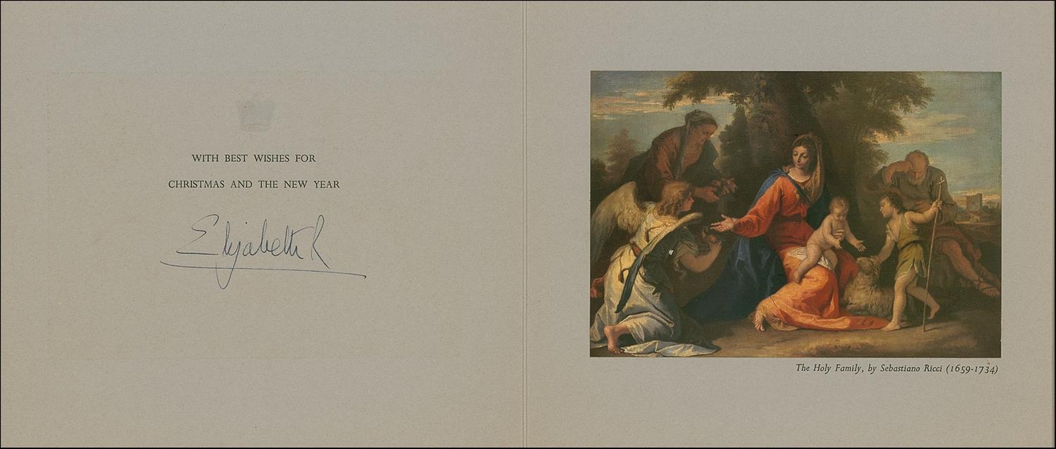 Original 9 x 7.75 Christmas card, undated, with embossed seals from the House of Windsor on the front. The interior features a print of The Holy Family by Sebastiano Ricci. Opposite the photo is a pre-printed Christmas sentiment and signed in blue ink, “Elizabeth R.” In fine condition.