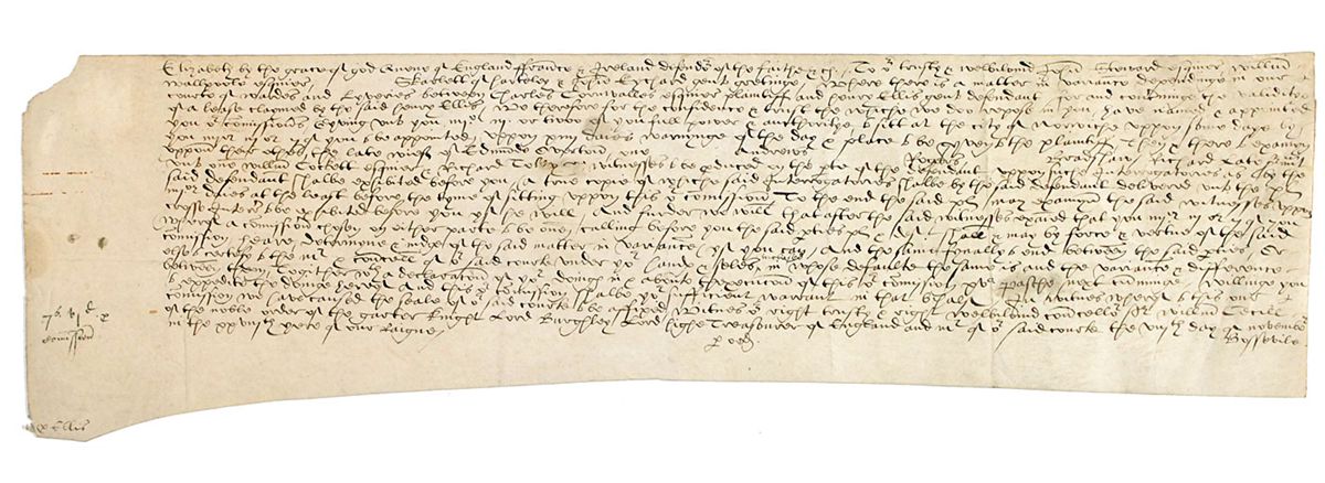 Unsigned Elizabethan-era manuscript DS, one page, 17.25 x 4.5, November 8, 1586. Period copy of a document appointing a commission to judge a land dispute, which had been issued by Lord William Cecil to the appointees. In part: “Elizabeth, by the Grace of God, Quene of England, France & Ireland, Defendour of the Faithe, etc. To our trusty and welbeloved John Steward…William Wallpoole…& John Eychard…Greetings. Where there is a matter in variance dependinge in our courte of wardes and liveries between Charles Cornwalles, Esq, Plaintiff, and Henry Ellis, Defendent, for concerninge of the validitye of a lease claymed by the said Henry Ellis, we therefore for the confidence & trust that of which we do repose in you, have named and appointed you our commissioners.” Multiple vertical storage folds and light soiling, otherwise fine condition.