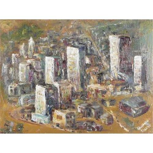 2375 Elizabeth Kessler, Oil on Board Abstract City Scape 1955 Signed lower right 12" x 18"