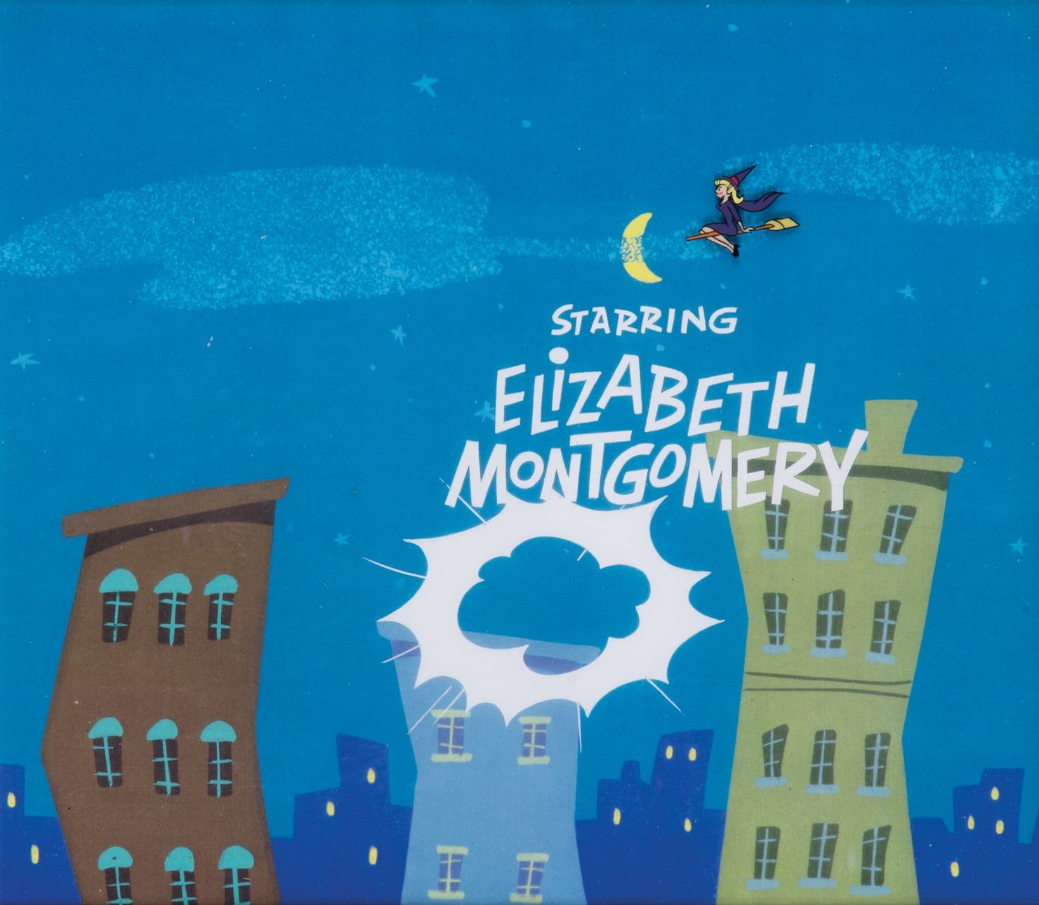15. Elizabeth Montgomery "Samantha Stephens" opening title animation cel from Bewitched. (Screen Gems/Hanna Barbera Studios, 1964) Vintage original rare production cel from the "Sponsored By Chevrolet" sequence of the opening titles for the 1st Season of Bewitched. The title sequence was animated by Hanna-Barbera Studios for Screen Gems. The slightly trimmed cel measures 10 x 9 in. visible through mat and frame, and has been placed on a matching color copy background with text. Exhibiting minor age and handling. In vintage fine condition. Provenance: Butterfield & Butterfield, March 1997. Previously from the Comisar Collection. $2,000 - $3,000