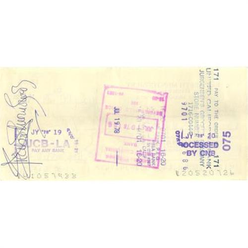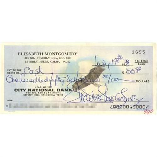 <B>Elizabeth Montgomery Signed Check.</B></I> Personal check for $150 cash, dated July 19, 1978 and signed on the front and endorsed on the back by the <I>Bewitched</B></I> star in blue ink. In Very Fine to Excellent condition. <I>Accompanied by a COA from PSA/DNA.</B></I><BR><BR><b>Shipping:</b> Flat Material, Small (<a target="_blank" href="http://www.heritageauctions.com/common/shipping.php">view shipping information</a>)
