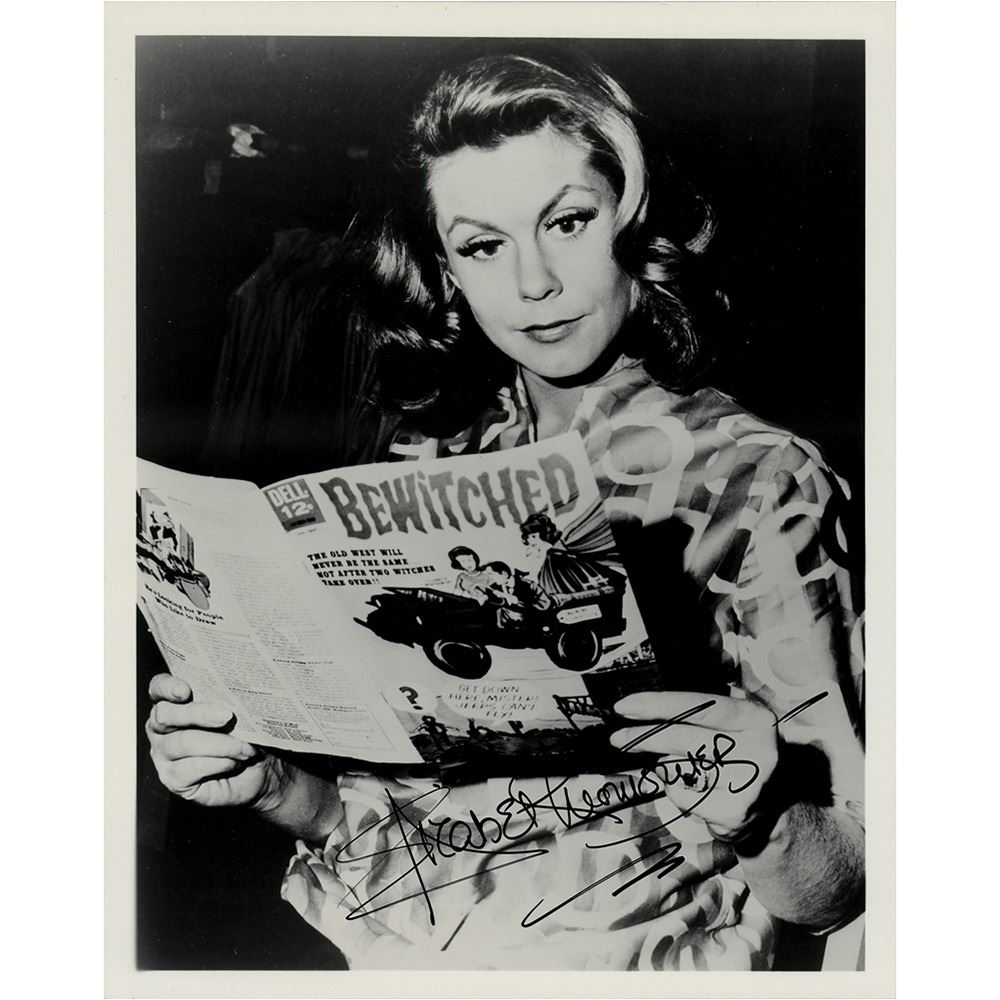 Glossy 8 x 10 photo of Elizabeth Montgomery reading a Bewitched comic book, signed in black felt tip. In fine condition.