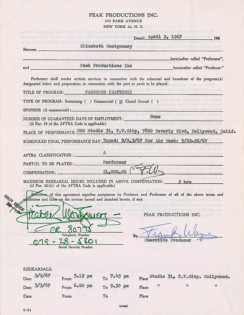 DS, one page both sides, 8.5 x 11, April 3, 1967. Agreement between Montgomery and Peak Productions for Montgomery to appear on the game show Password on CBS for the salary of $1000.00. Signed at the conclusion by Montgomery, who adds her phone number and Social Security number. In fine condition, with expected folds, paperclip impressions to top edge, and an office stamp next to signature.