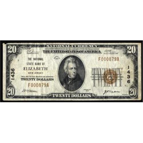 Elizabeth, NJ. $20 1929 Ty. 1. The National State Bank. Charter #1436. Fine.