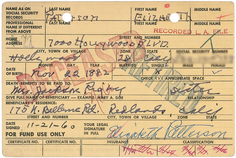 American character actress (1875–1966) best-known for her role as the elderly neighbor Matilda Trumbull on I Love Lucy. Patterson’s yellow AFTRA union P&W benefits card, one page, both sides, 6 x 4, dated November 21, 1960. Pension and Welfare benefit card is filled out by Patterson, printing her full name, Hollywood address, birthdate, and Social Security number. Signed at the bottom “Elizabeth Patterson.” She lists her sister as the recipient of her death benefits. Stamped across the front of the card is “Deceased” and “Retired.” Two hole punches to her printed name at top, several office notations, including one lightly affecting beginning of signature, staple holes at top left, and aforementioned stamps, otherwise fine condition.