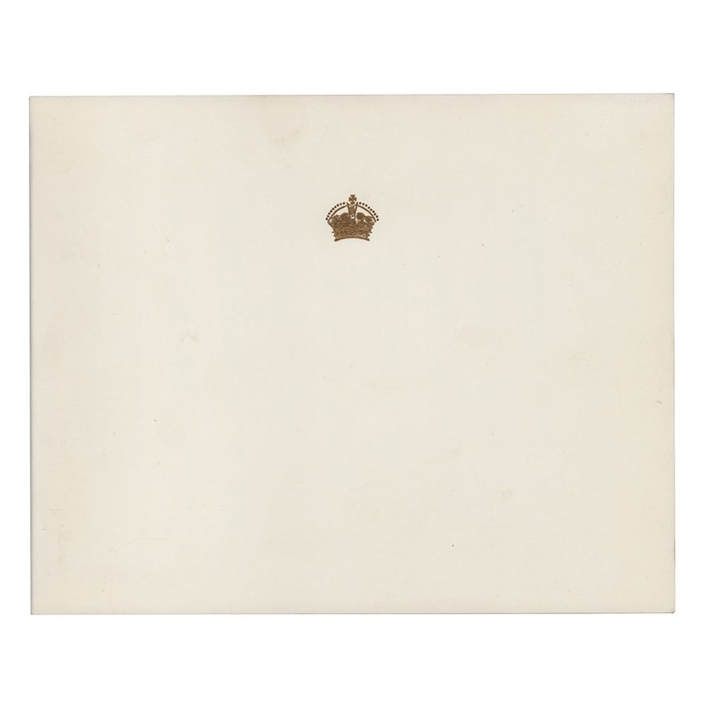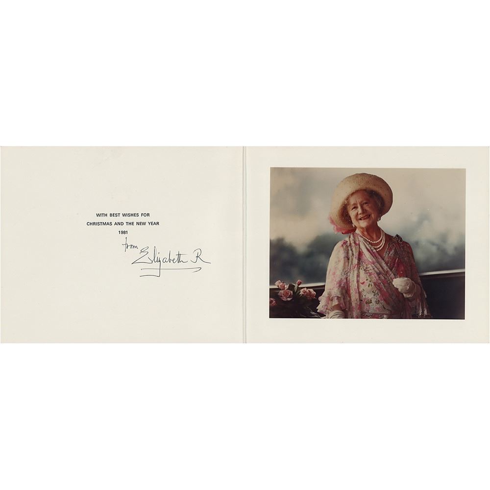Desirable Royal Christmas card from 1981 with an embossed crown on the front, measuring 18 x 7.25 open, with the inside bearing an affixed image of the Queen Mother in a pleasant half-length pose, signed on the adjacent page in black ballpoint, "from, Elizabeth R." In fine condition.