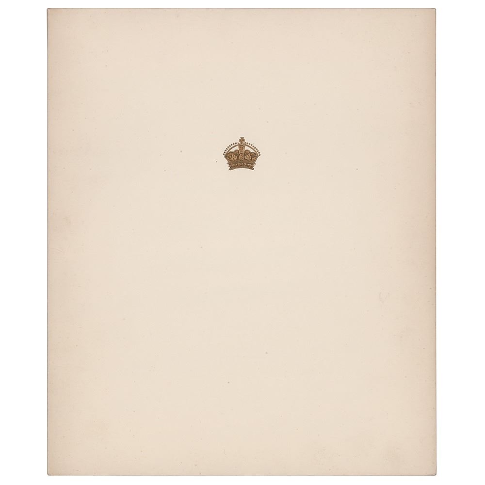 Desirable Royal Christmas card from 1967 with an embossed crown on the front, measuring 15.5 x 9.25 open, with the inside bearing an affixed image of the Queen Mother posing on a ship’s reeling off Newfoundland, signed on the adjacent page in blue ballpoint, "from, Elizabeth R." In fine condition, with light toning along the inner hinge.