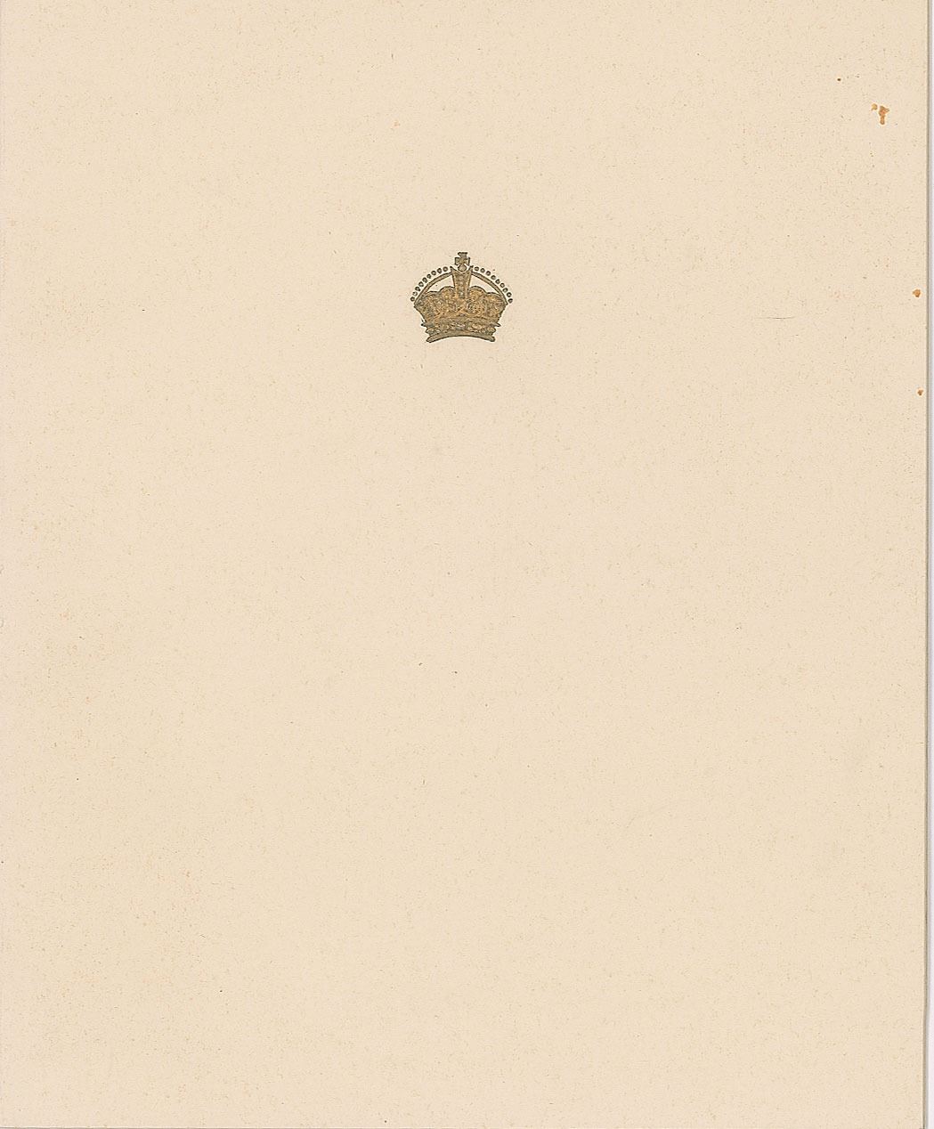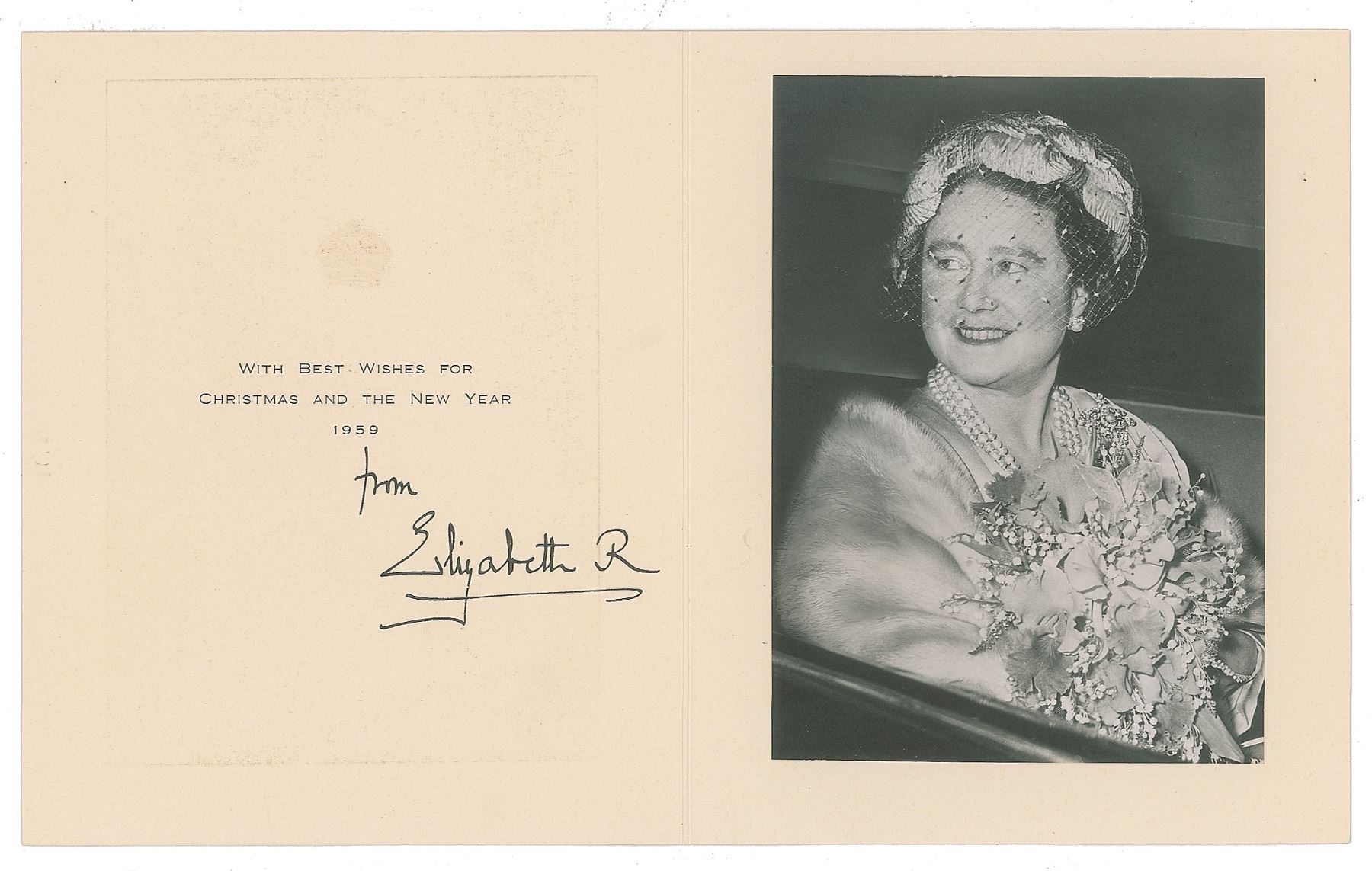 Desirable Royal Christmas card from 1959 with an embossed crown on the front, measuring 13.5 x 8.25 open, featuring an attractive image of the Queen Mother, signed on the adjacent page in fountain pen, "from, Elizabeth R." In fine condition.