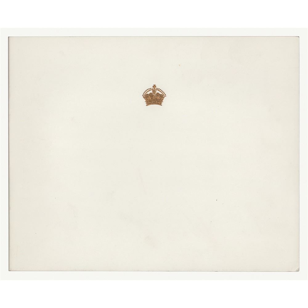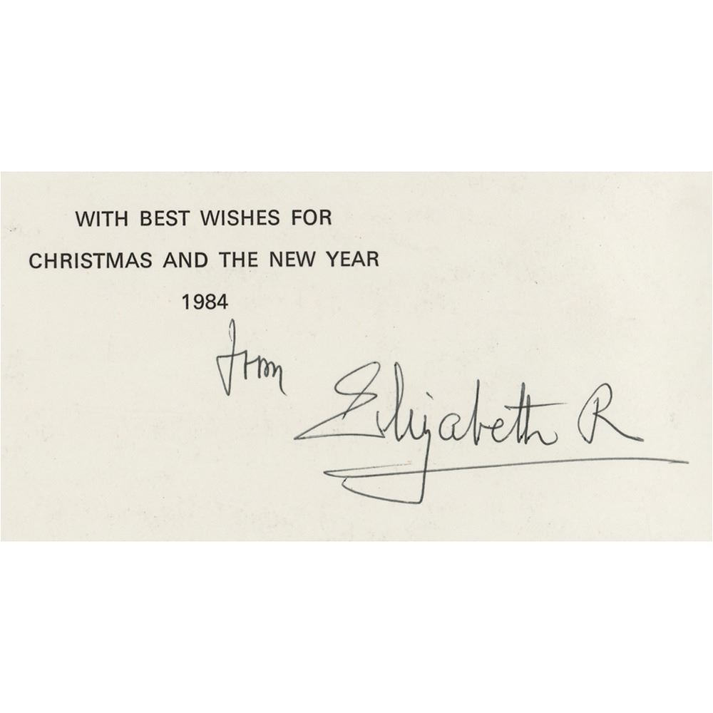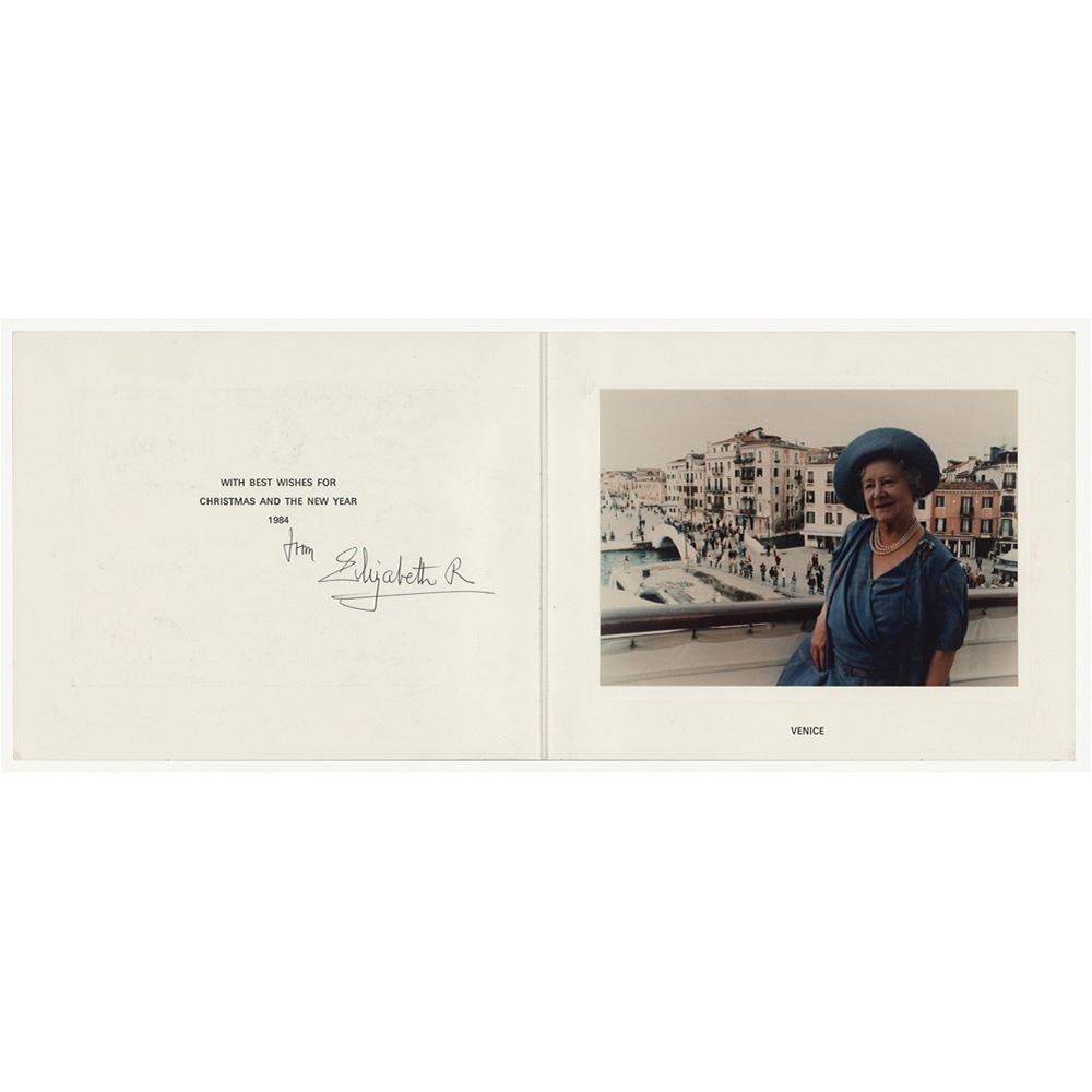 Desirable Royal Christmas card from 1983 with an embossed crown on the front, measuring 18 x 7.25 open, with the inside bearing an affixed image of the Queen Mother on holiday in Venice, signed on the adjacent page in black ink, "from, Elizabeth R." In very fine condition.