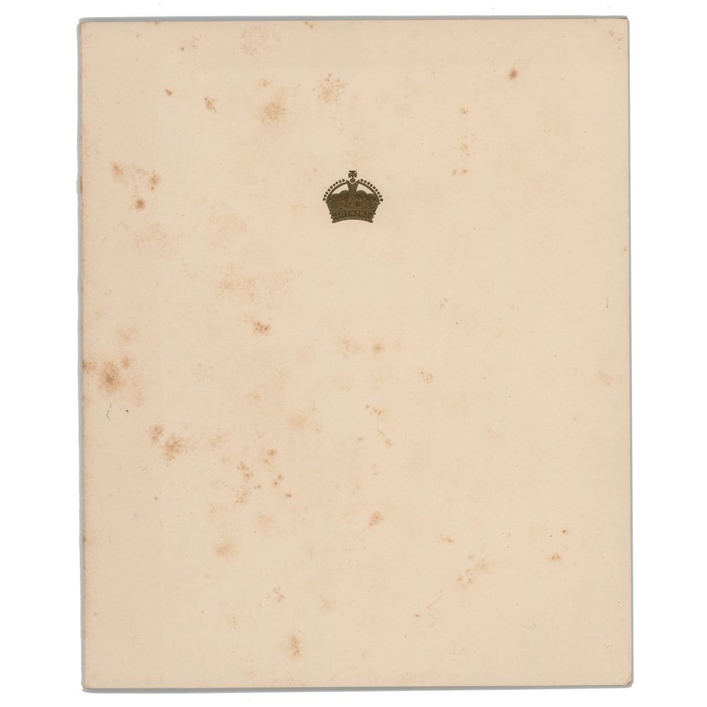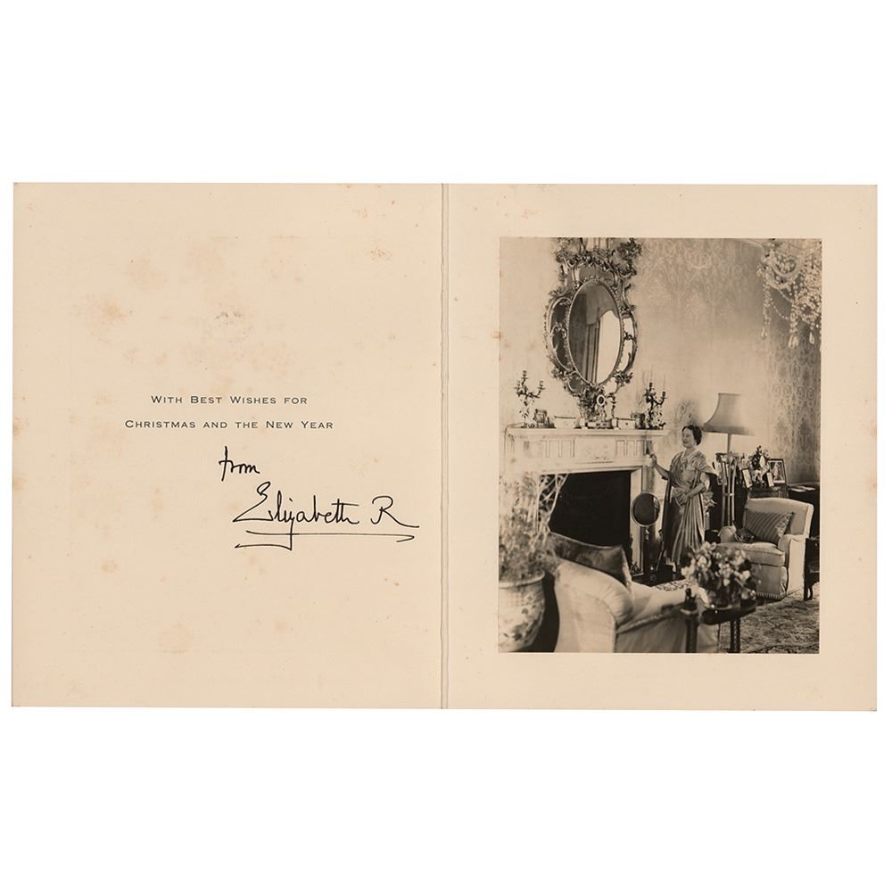 Royal Christmas card with an embossed crown on the front, measuring 13.5 x 8.25 open, with the inside bearing an affixed photograph of the Queen Mother inside a lavishly decorated palace room, signed below the printed Christmas greeting in fountain pen, "from, Elizabeth R." In very good to fine condition, with scattered foxing, heaviest to the outside covers.