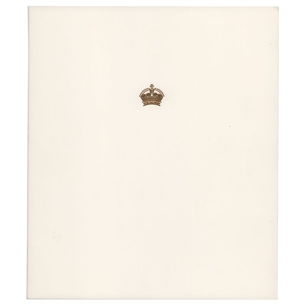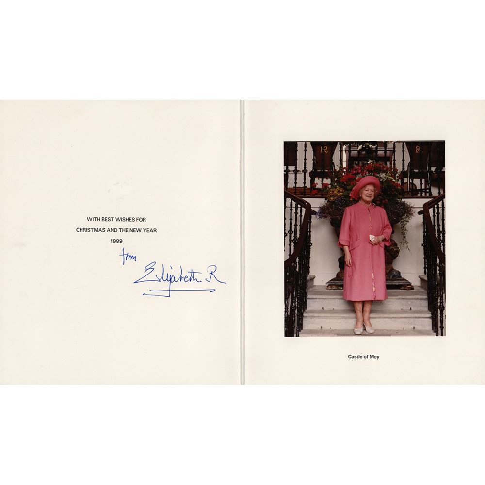 Royal Christmas and New Year's card from 1988 with an embossed crown on the front, measuring 15 x 8.75 open, with the inside bearing an affixed photograph of the Queen Mother at the Castle of Mey, signed below the printed greeting in fountain pen, "from, Elizabeth R." In very fine condition. Accompanied by the original mailing envelope.