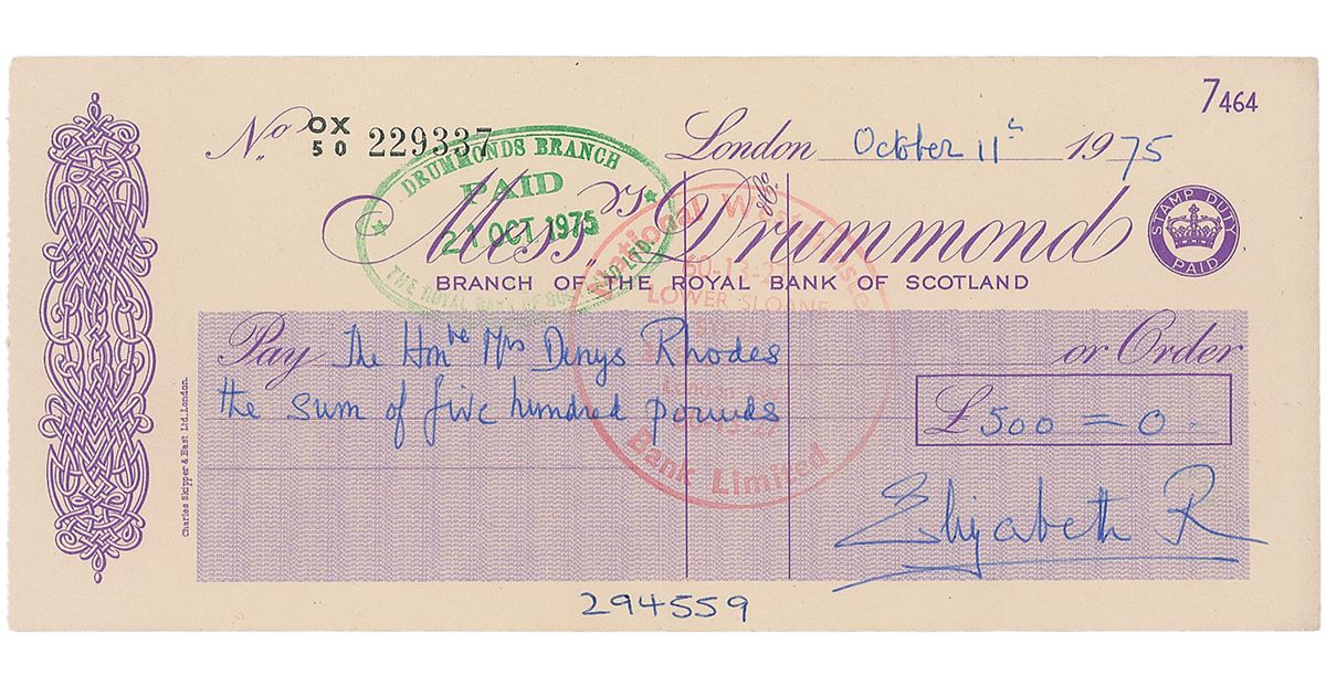 Bank check, 8 x 3.5, filled out and signed by the Queen Mother, “Elizabeth R,” payable to the Honble. Mrs. Denys Rhodes for £500, October 11, 1975. In fine condition, with expected bank stamps.