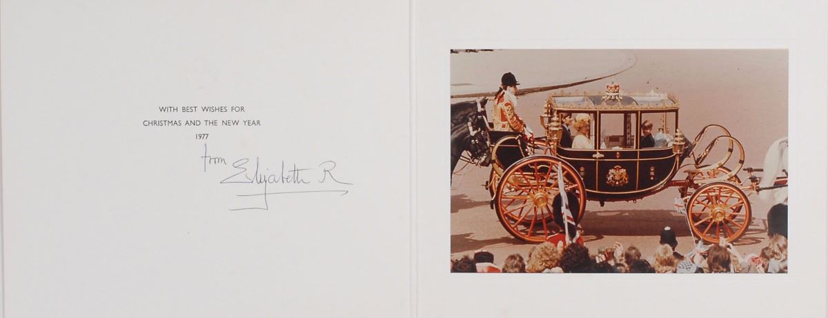 Christmas card from 1977 featuring an embossed royal crown on the front, measuring 18.5 x 7.25 open, with a photo of the Queen Mother and her grandchildren riding in a carriage affixed inside, signed inside below a printed Christmas and New Year’s greeting in black ballpoint, “from Elizabeth R.” In fine condition, with trivial toning and creasing.