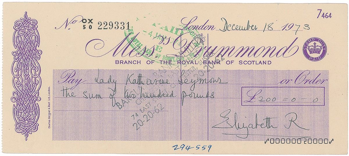 Drummonds Bank check, 8 x 3.5, filled out and signed by the Queen Mother, “Elizabeth R.,” payable to Lady Katharine Seymour for £200, December 18, 1973. In fine condition.