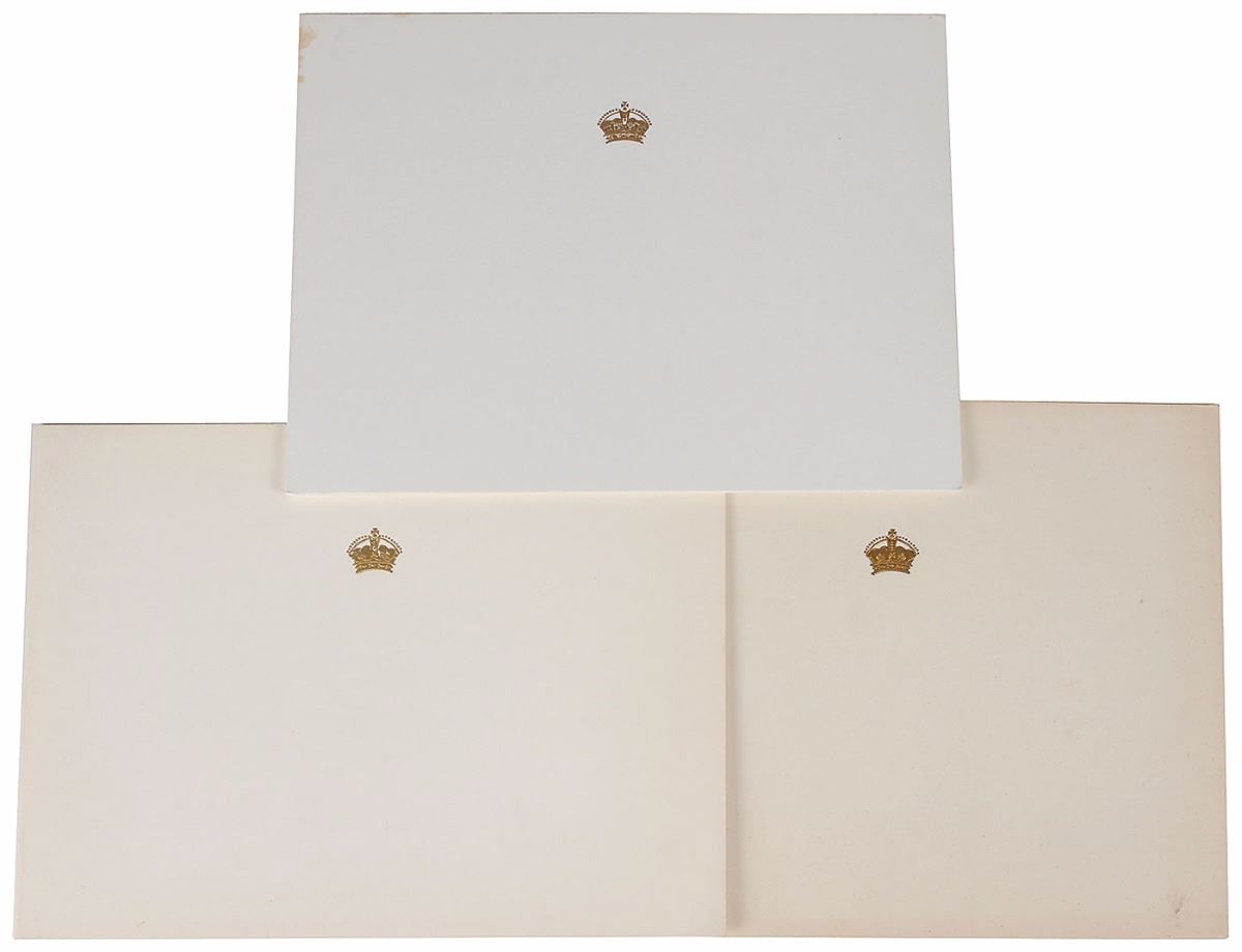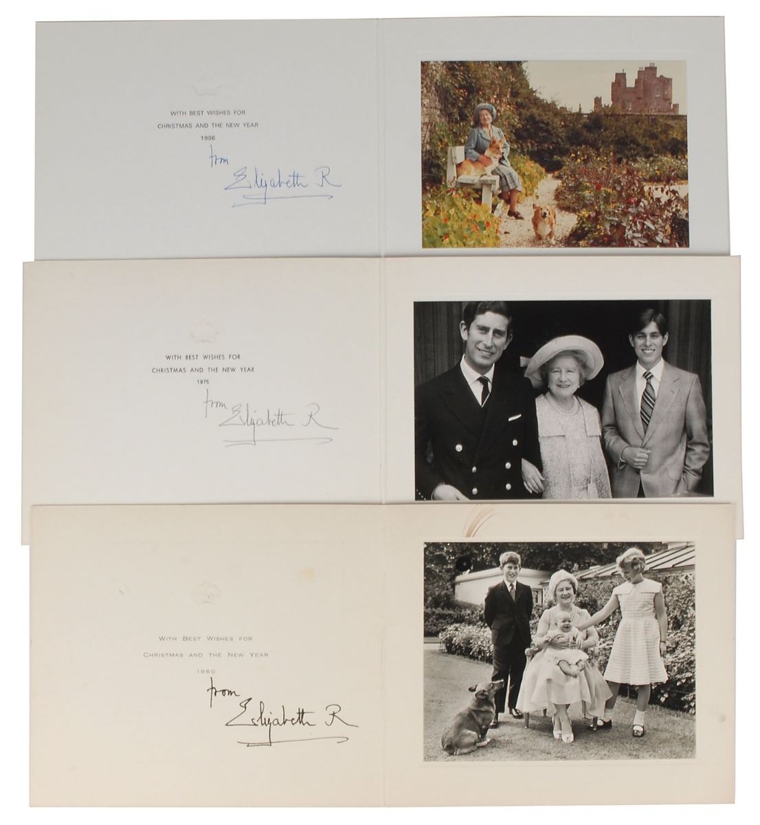 Three Christmas cards, each signed in ink or ballpoint, "from Elizabeth R," ranging in size from 18.5 x 7.25 to 18 x 7.75 (measured open), dated to the years 1960, 1975, and 1986. Each with a photo of the Queen Mother affixed inside adjacent to the signature page, including: one with Prince Charles and Prince Andrew; one with her grandchildren and corgi; and another of her seated with two corgis in a courtyard. In overall fine condition, with some scattered light soiling, and a small circular stain to the image in the 1960 card. Pre-certified PSA/DNA.