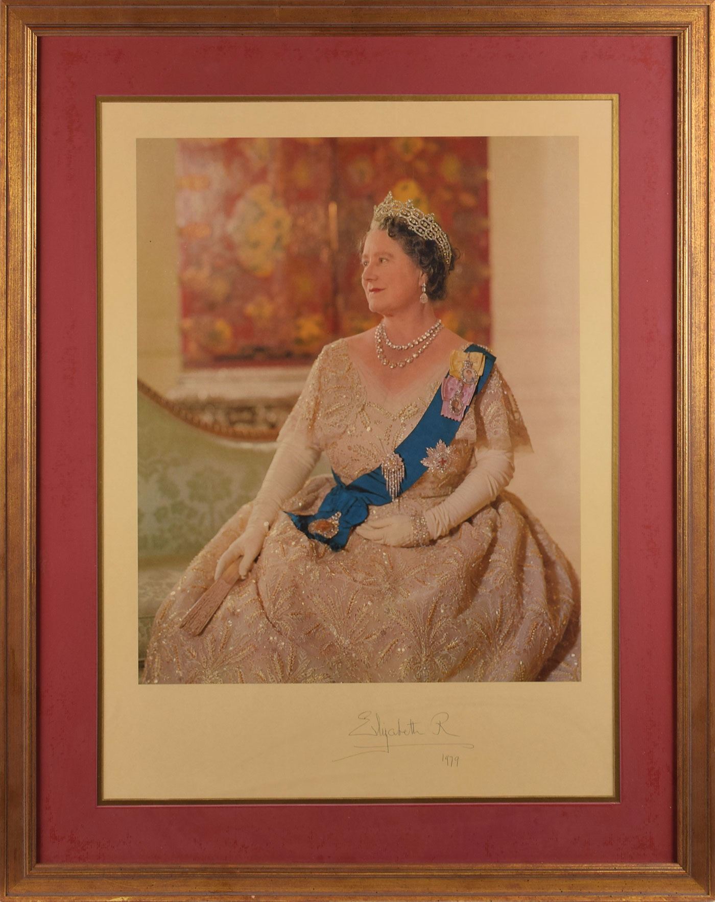 Massive color matte-finish 18.25 x 25 portrait of Queen Elizabeth in an exemplary seated pose, signed in the lower border in black ballpoint, "Elizabeth R., 1979." Double-matted and framed to an overall size of 25.5 x 32. In fine condition. Without peer, this is the largest signed photo of the Queen Mother that we have ever offered.