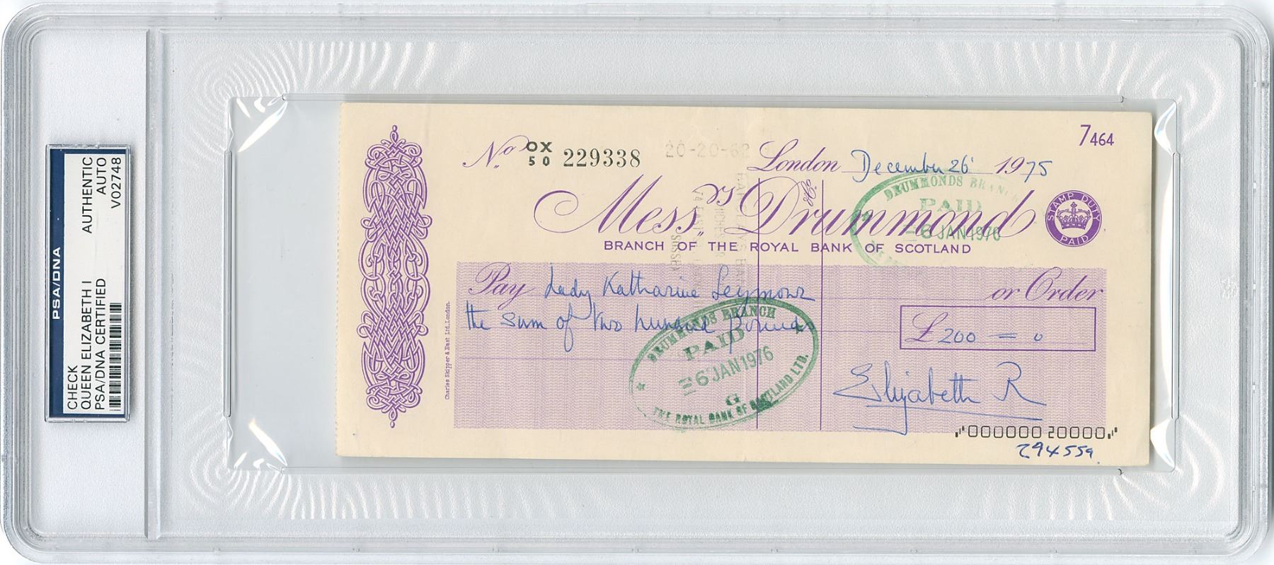 Messrs. Drummond, Royal Bank of Scotland check, 8 x 3.5, filled out and signed by Elizabeth, Queen Mother, "Elizabeth R," payable to Lady Katharine Seymour for £200, December 26, 1975. In fine condition. Encapsulated in a PSA/DNA authentication holder and accompanied by a full letter of authenticity from PSA/DNA.