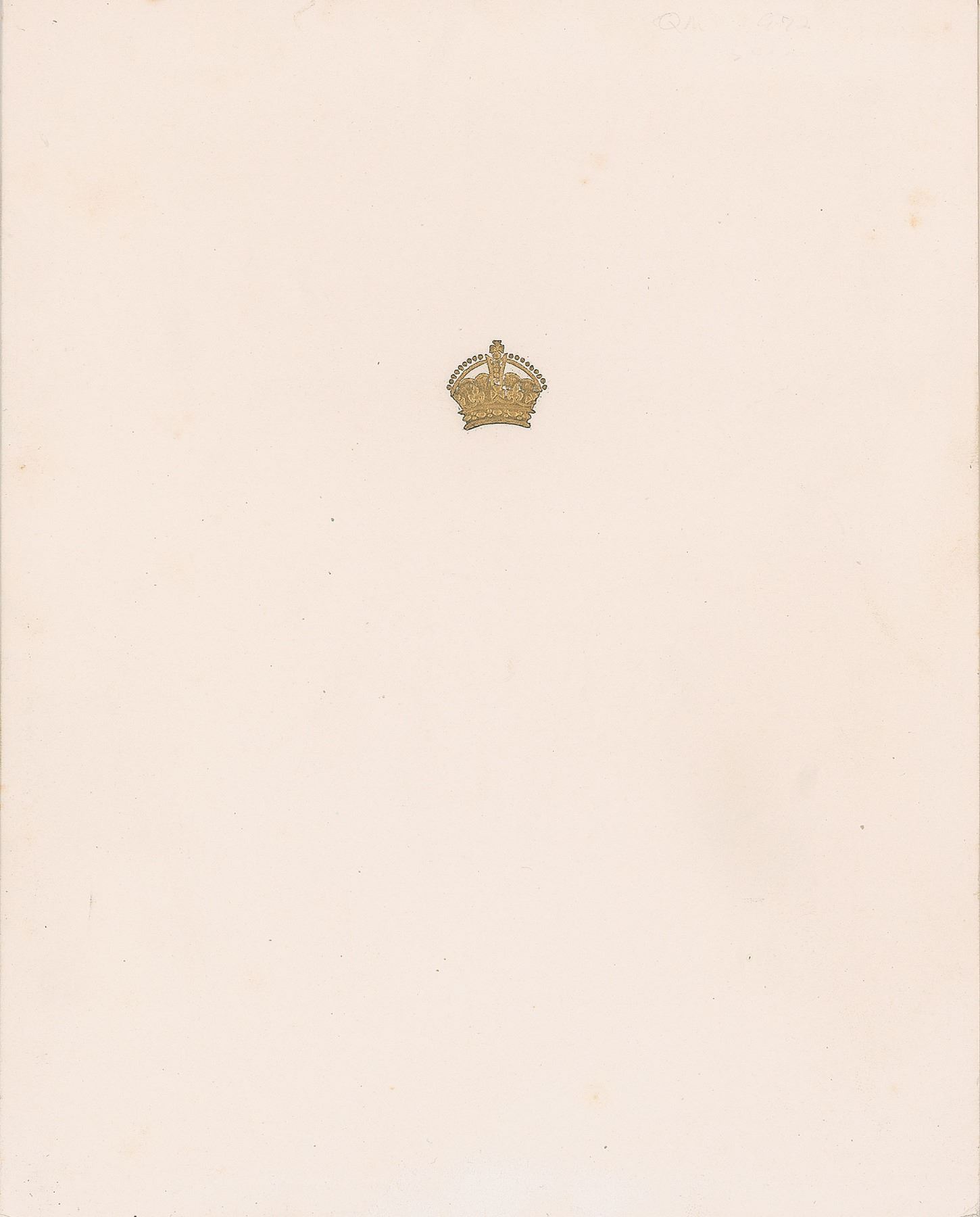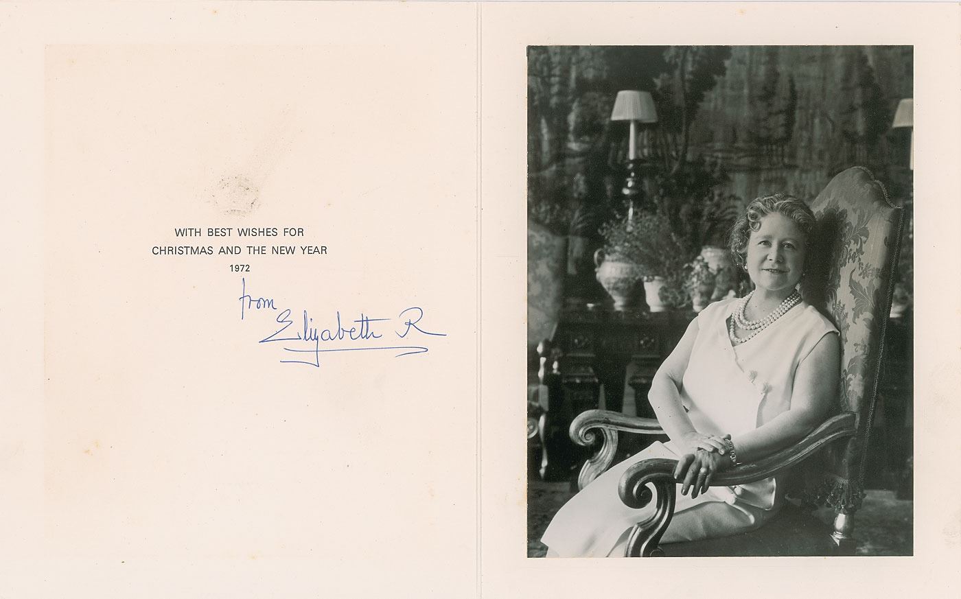 Christmas card from 1972 featuring an embossed royal crown on the front, measuring 14.75 x 9 open, with an exceptional seated portrait of the Queen Mother affixed inside, signed on the adjacent page below a printed Christmas and New Year’s greeting in blue ballpoint, “from Elizabeth R.” In fine condition, with a few trivial spots of foxing.