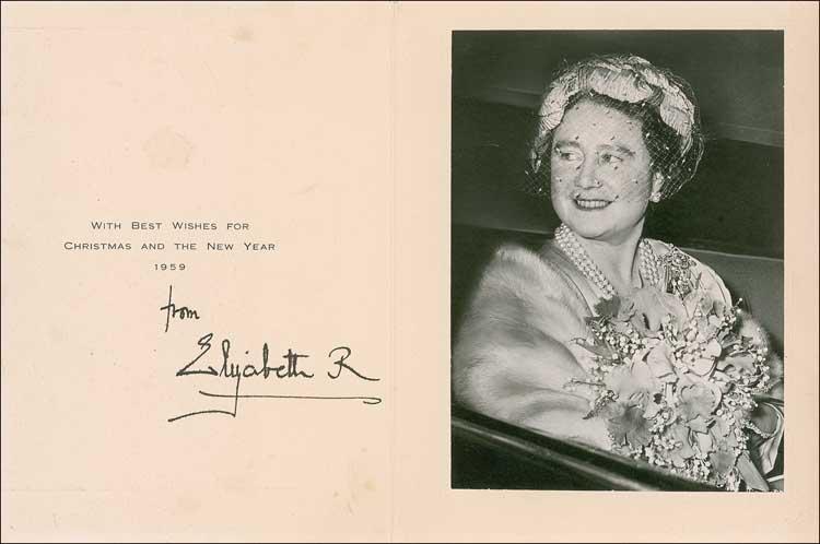 Christmas card from 1959, measuring 6.5 x 8.25 closed, with the inside bearing a portrait of the Queen Mother riding in a car, signed opposite the photo under the pre-printed holiday sentiment, “From Elizabeth R.” In very good condition, with light overall feathering to signature, a light vertical crease through last letter of signature, and a bit of scattered light soiling. Pre-certified PSA/DNA and RRAuction COA.