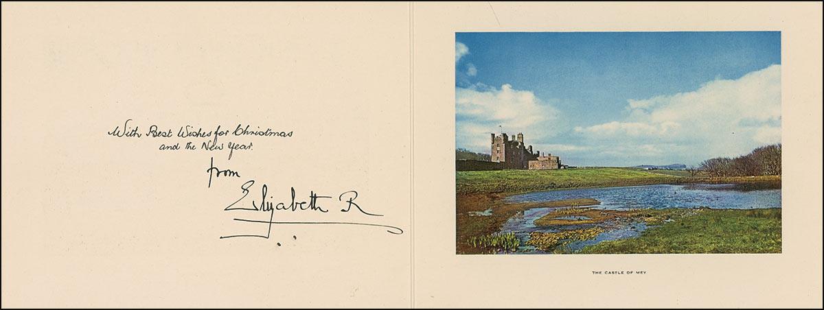 Undated Christmas card, measuring 8.25 x 6.5 closed and bearing a gold-embossed crown on the front. Inside bears a color portrait of the Castle of Mey. Opposite the portrait is a pre-printed sentiment signed underneath, “from Elizabeth R.” In fine condition, with two small ink dots under signature. Pre-certified PSA/DNA and RRAuction COA.