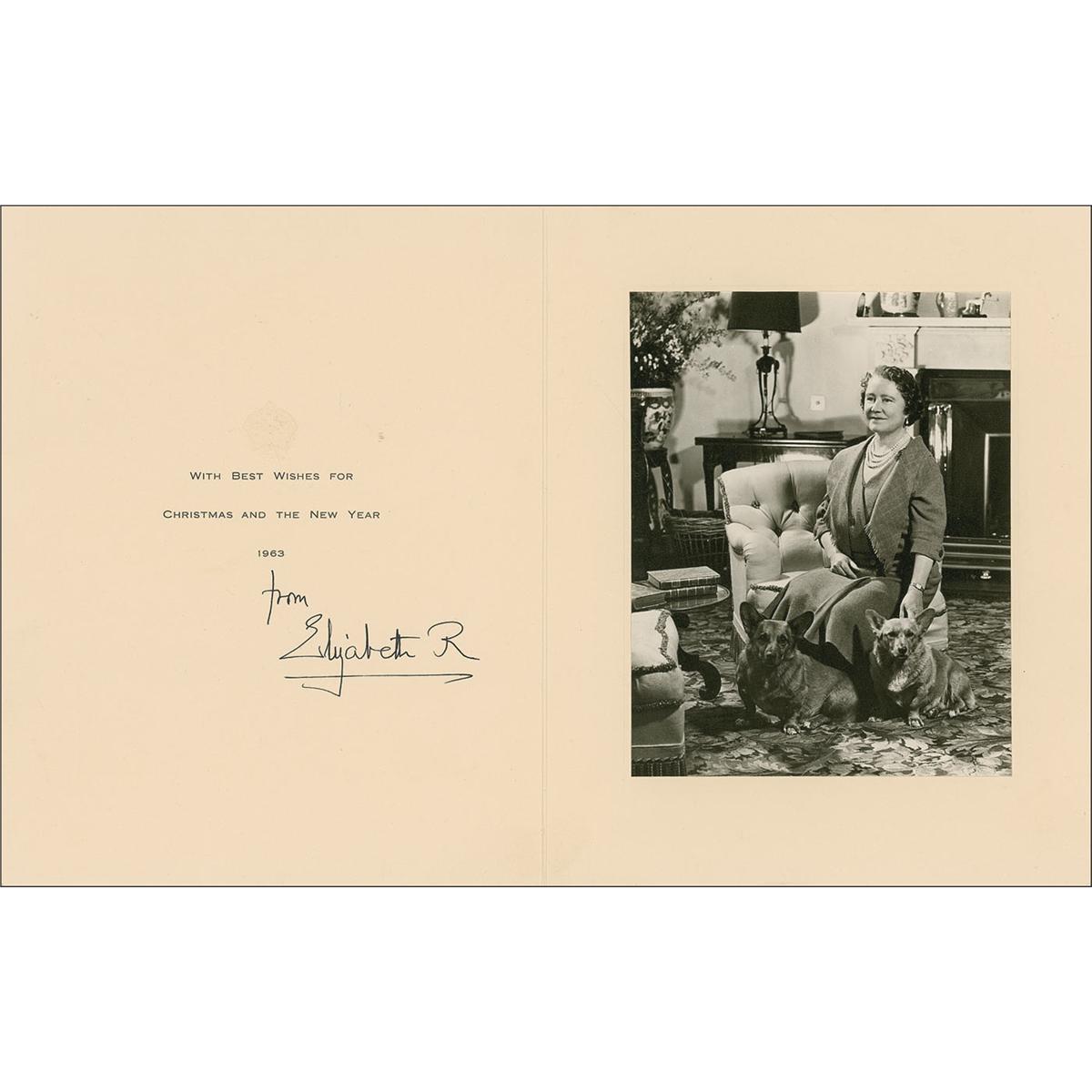 Christmas card from 1963, measuring 8 x 10 closed, with the inside bearing a portrait of the Queen Mother with two Welsh Corgis, signed opposite the photo under the pre-printed holiday sentiment, “From Elizabeth R.” In fine condition, with light soiling to the front cover.