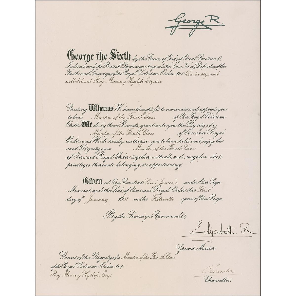 Partly-printed DS, signed “Elizabeth R,” one page, 12.5 x 15, January 1, 1951. Elizabeth appoints Roy Murray Hystop “a Member of the Fourth Class of Our Royal Victorian Order.” Signed at the conclusion in black ink by Elizabeth and also bearing a pre-printed “George R.,” signature at the top. In fine condition, with a central horizontal fold, and some light damp staining along left edge.