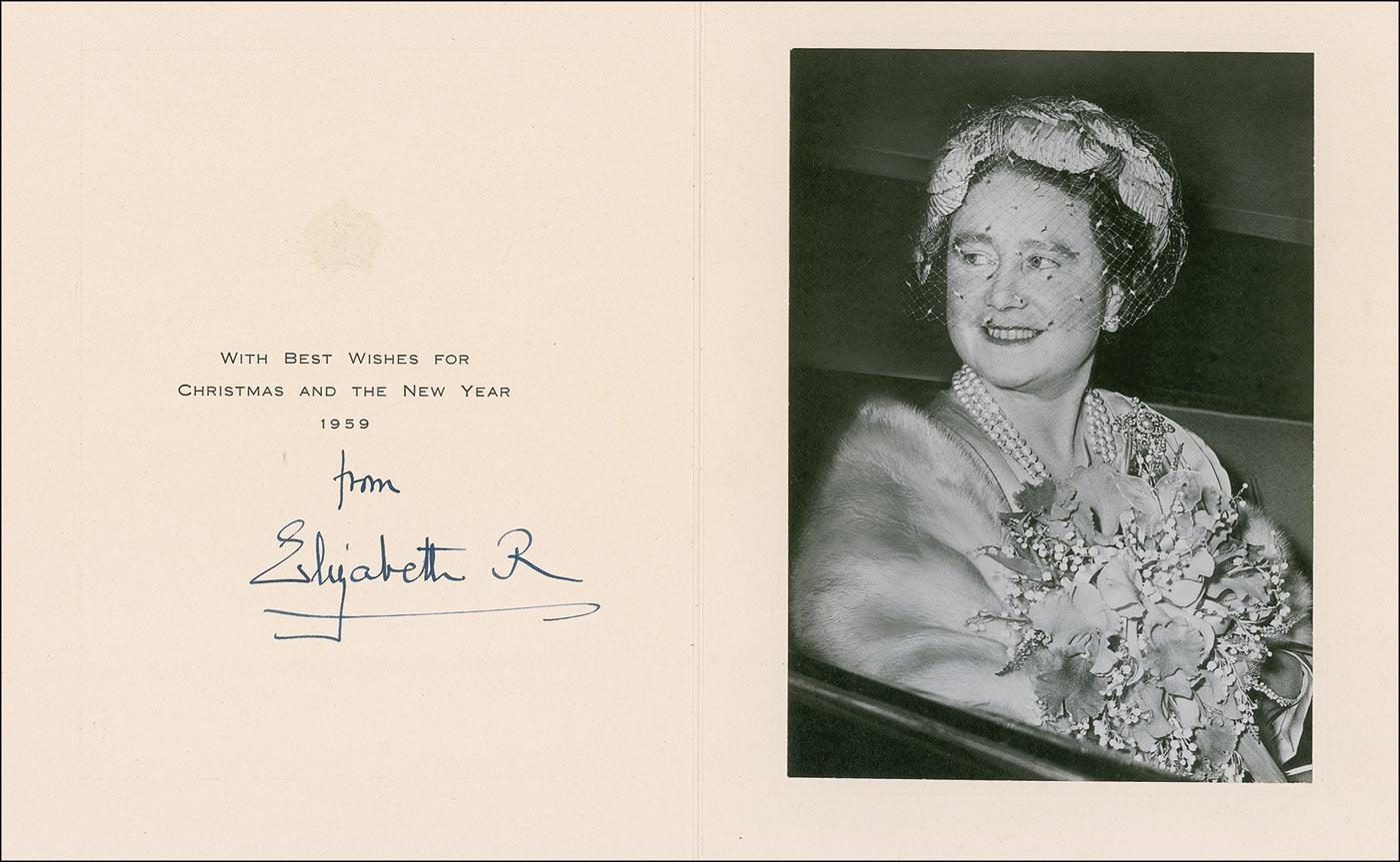 Christmas card from 1959, measuring 6.75 x 8.25 closed and bearing a gold-embossed crown on the front. Inside bears a 5 x 7 image of Elizabeth seated in a vehicle. Opposite the photo is a pre-printed Christmas sentiment and signed in black ink, “From Elizabeth R.” In fine condition.