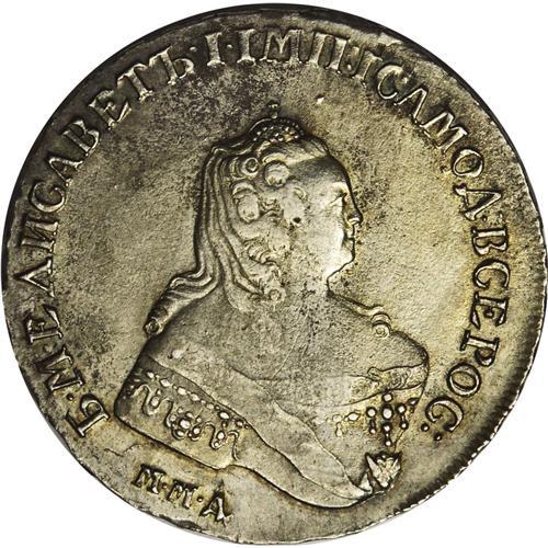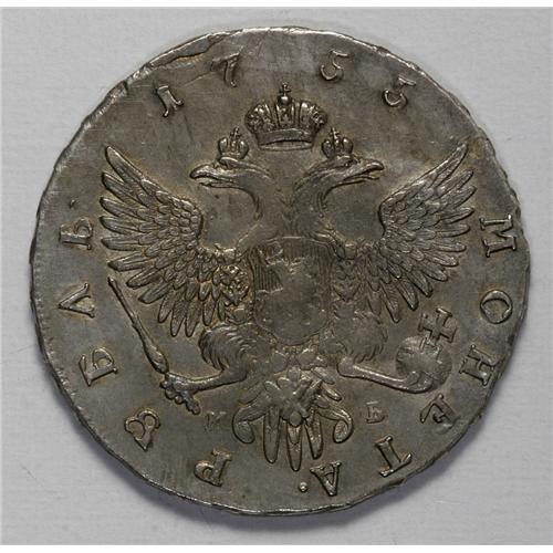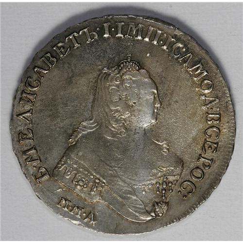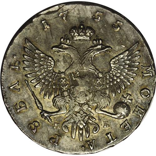 <B>Elizabeth. Rouble 1755 MM?-M?,</B></I> Bit-136, XF details with slightly porous obverse surfaces and some remaining luster. The reverse has a few, barely noticeable, flan flaws.<BR><I>From the Monedas Oro Collection</B></I><BR><BR><b>Shipping:</b> Coin/Currency (<a target="_blank" href="http://www.heritageauctions.com/common/shipping.php">view shipping information</a>)