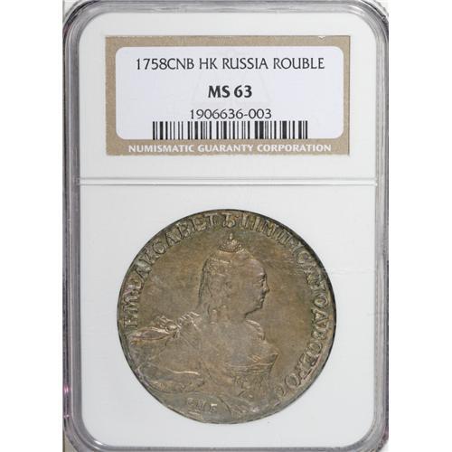 <B>Elizabeth. Rouble 1758 C??-H?,</B></I> Ivanov portrait, Dassier eagle, Bit-287, MS63 NGS. Golden-brown patina with full underlying luster. Rare in this condition.<BR><BR><b>Shipping:</b> Coin/Currency (<a target="_blank" href="http://www.heritageauctions.com/common/shipping.php">view shipping information</a>)