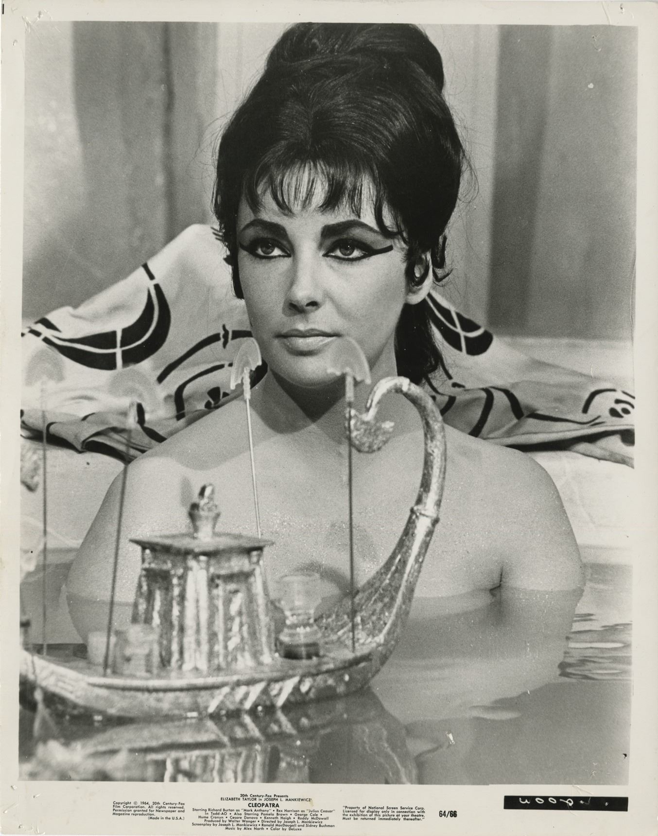 186. Elizabeth Taylor (13) production photographs from films including Giant and Cleopatra. (ca. 1950s-1960s) Vintage original (13) gelatin silver production photographs on single-weight paper ranging in size from 6.5 x 9 in. to 8 x 10 in. including (1) Giant with James Dean, (1) Suddenly Last Summer, (4) Cleopatra, 1-with Rex Harrison and (7) Reflections in a Golden Eye, 3-with Marlon Brando. Exhibiting minor age and handling. Some with studio slugs and some retaining snipes or ink stamps on the verso. In vintage very good to fine condition. $200 - $300