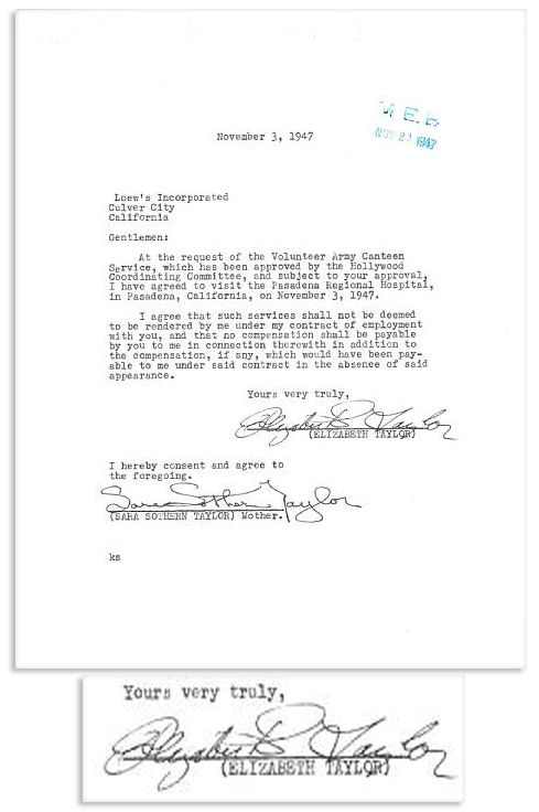 Elizabeth Taylor contract signed, dated 3 November 1947 and addressed to Loew's Incorporated. Here, MGM releases Taylor as she agrees to visit a hospital in Pasadena, California at the request of the Volunteer Army Canteen Service. Signed boldly ''Elizabeth R. Taylor'' in black ink. Document on one page measures 8'' x 10.5'' and is in near fine condition.