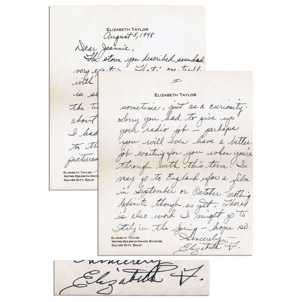 Elizabeth Taylor autograph letter signed, dated 5 August 1948 on her personal MGM stationery to Jeannie Gray, ''The storm you described sounded very exciting. That's one trouble with California - the weather is so much the same…I liked hearing about Philippine movie making. I hadn't really every stopped to think that they even made pictures over there. I'd like to see one of their films sometime, just as a curiosity…I might to go Italy in the Spring - hope so.'' Signed ''Elizabeth T''. Two 6'' x 7'' pages on two separate sheets. Near fine.