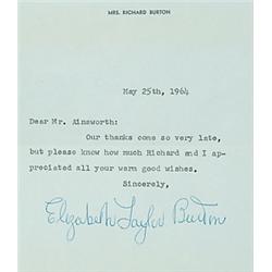 A binder containing Elizabeth Taylor material including: a handwritten letter to Mr Ainsworth on "Mrs. Richard Burton" letterhead, 11 autographed photographs including one signed by Richard Burton and various press clippings.
