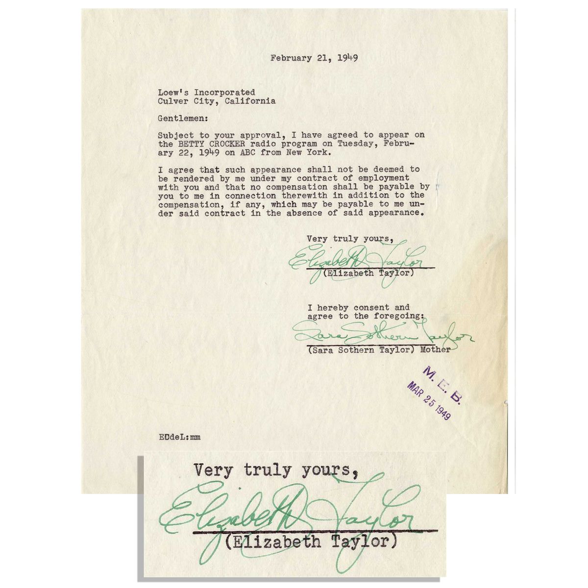Elizabeth Taylor contract signed, dated 21 February 1949, addressed to Taylor's employer Loew's Inc. and co-signed by Taylor's mother, Sara Sothern Taylor. Letter informs Loew's Inc. that Taylor has agreed to appear on the Betty Crocker Radio Program and that ''…such appearance shall not be deemed to be rendered by me under my contract of employment with you and that no compensation shall be payable…'' Contract measures 8'' x 9.5'' on one page with expected folds from mailing, else near fine.