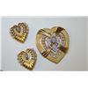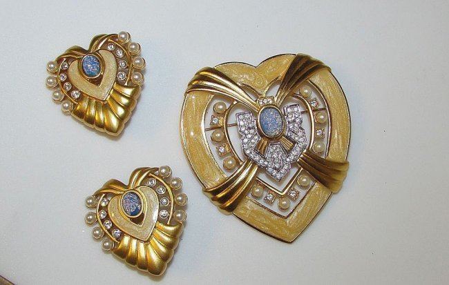 For your consideration is this exquisite Elizabeth Taylor for Avon "Heart of Hollywood" set in wonderful condition. This fabulous designer statement demi parure is an absolute show stopper. The pieces features heart shaped design accented with heavy gilt, gorgeous enamel, lustrous faux pearls, sparkly rhinestones and mysterious faux opals. The brooch measures 3" long by 2 3/4" wide and the clip on earrings measure 1 1/2" long by about 1" wide. All pieces bear Elizabeth Taylor hallmark. Outstanding addition to any jewelry collection!