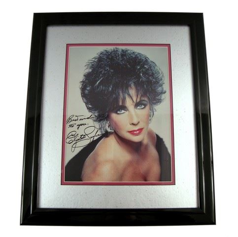 Elizabeth Taylor Large Color Signed Matted & Framed Photo - From the last legendary superstar to come out of the famous Hollywood Studio system in its "Golden Age", as well as the first actor to ever get one million dollars to star in a motion picture ("Cleopatra" in 1963), Elizabeth Taylor's career began as a child actress at MGM at 12 years old at the height of classic Hollywood, and continued for over 50 years, into the 21st Century. This is a spectacular large rare color photo of Elizabeth Taylor shot in the late 1960's when her career was still boiling hot. She has boldly signed it with "Best Wishes To You - Elizabeth Taylor". The photo is tripled matted and professionally framed. Comes with a Certificate of Authenticity from Baseball Cards- Movie Collectables. Frame is approx. 11"x14" Matted.